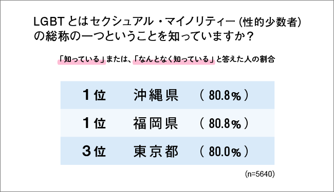 まず、LGBTとはセクシュアル・マイノリティーの総称の一つということを知っているかというストレート層の方への質問に対して、「知っている」「なんとなく知っている」という回答の合計が最も多かったのは沖縄県と福岡県、続いて東京都という結果でした。
