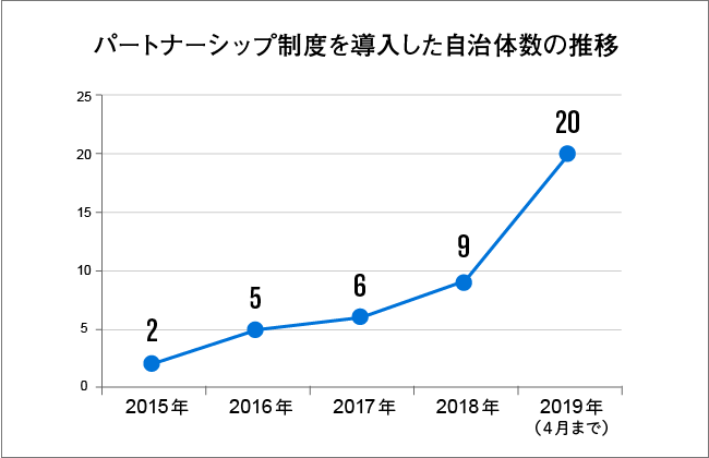 それから4年、パートナーシップ宣誓制度を定める地方自治体は着実に増え、2019年4月1日には、東京都江戸川区、豊島区、府中市、神奈川県横須賀市、小田原市、大阪府堺市、枚方市、岡山県総社市、熊本県熊本市の9都市がパートナーシップ宣誓制度を同時に開始するなど、20の地方自治体にまで広がりました。