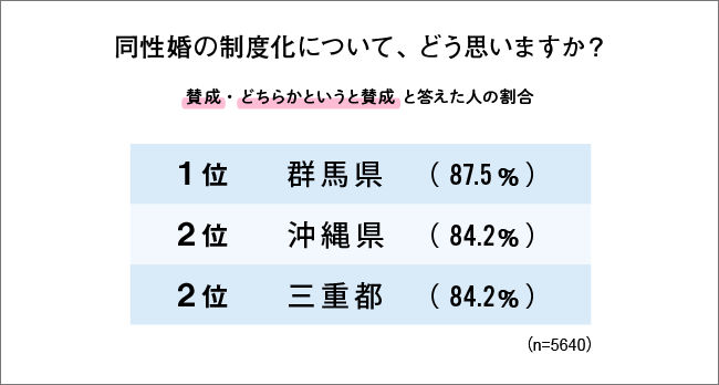 また、「同性婚の制度化について、どう思いますか?」という問いでは、ストレート層の方の賛成の比率が全国平均で78.4%だったのに対し、1位の群馬県で87.5%、2位が沖縄県と三重県で84.2%という結果となりました。