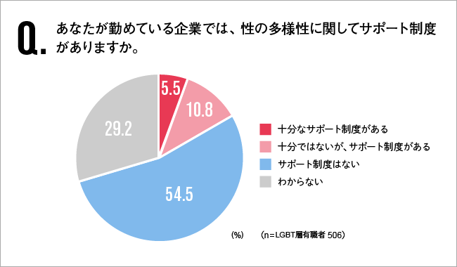 また、「あなたが勤めている企業では性の多様性に関してのサポート制度がありますか?」という問いに対する当事者の回答は、「ある」は16.3%(十分なサポート制度がある5.5%、十分ではないがサポート制度がある10.8%)にとどまっており、制度の対応が進んでいるとは言えない現状があります。