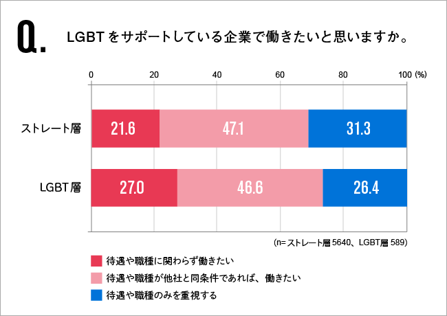 さらに「待遇や職種に関わらず働きたい」というトップボックスについては、21.6%と1.7倍になっています。これは取りも直さず、「LGBTにやさしい企業は全ての社員にもやさしく、個性を尊重して働きやすい環境である」という意見の表れであり、この3年間でその観点を重視する傾向が強まったためであると考えられます。