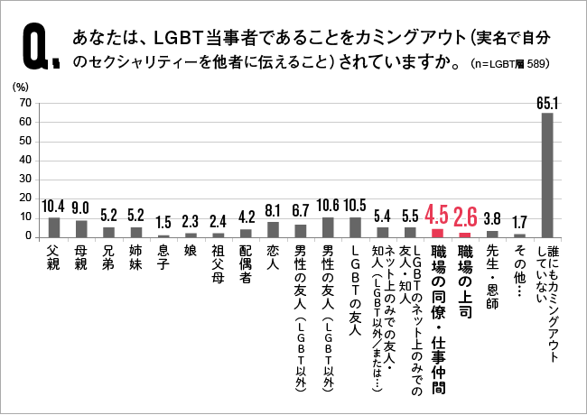 カミングアウトした相手として「職場の上司」は2.6%、職場の同僚へも4.5%と、職場でのカミングアウトは進んでいません。一方、「誰にもカミングアウトしていない」が65.1%に上り、圧倒的にカミングアウト自体が進んでないことが分かります。