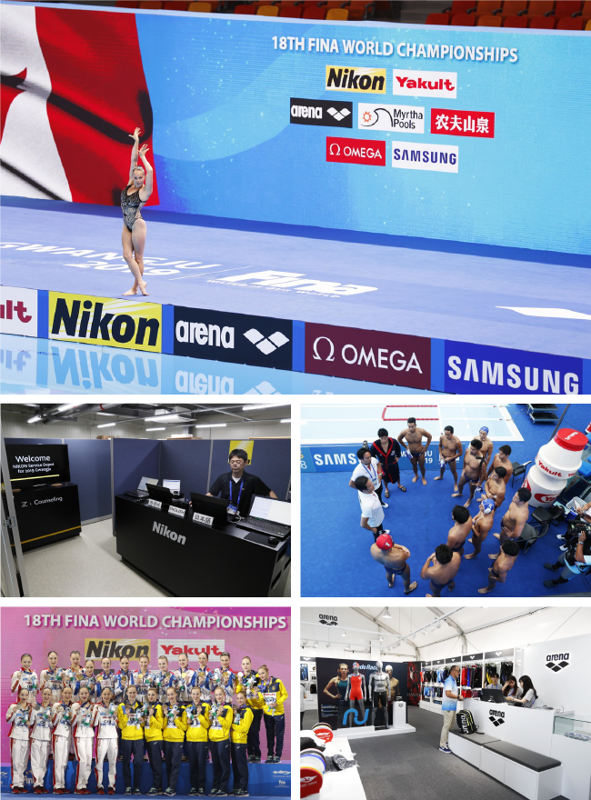2005年からFINAのオフィシャルパートナーを継続しているヤクルト本社や、2007年からパートナーを務めるニコンなどは、会場や選手のゼッケン、スイミングキャップでの社名表示をメインに、サービスデスクなど独自の活動を展開。ショップやブースを出展しアピールするパートナーも見られた。