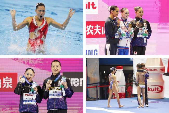 大会前半に行われたアーティスティックスイミングのソロテクニカルルーティンと同フリールーティンで乾友紀子選手が銅メダルを獲得。ミックスデュエットテクニカルルーティンと同フリールーティンで足立夢実・阿部篤史ペアがともに銅メダルに輝いた。