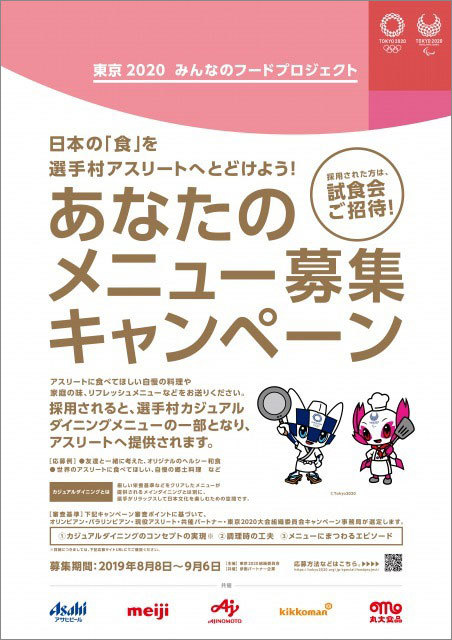 東京2020組織委は8月8日、東京大会の選手村(中央区晴海)に設けるカジュアルダイニングで提供する一部のメニューを一般公募する「東京2020みんなのフードプロジェクト 日本の『食』を選手村アスリートへとどけよう!あなたのメニュー募集キャンペーン」(共催=アサヒビール、明治、味の素、キッコーマン、丸大食品)を同日から開始したと発表した。