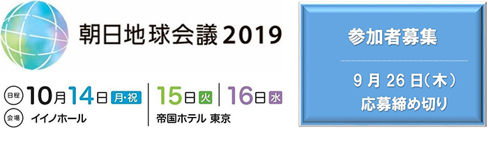 朝日新聞社は、地球規模の社会課題解決とSDGsについて議論する国際シンポジウム「朝日地球会議2019」を、10月14日に東京・千代田区のイイノホールで、15、16両日は帝国ホテル東京で開催する。