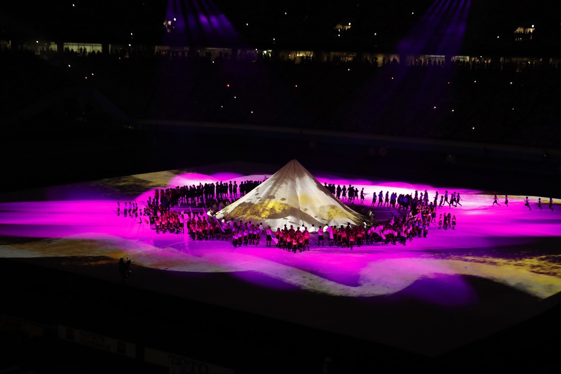 同日、調布市の東京スタジアムでは、開幕戦の日本対ロシアの試合に先立ち、プロジェクションマッピングを効果的に使った開会式が、約20分間にわたり華やかに行われた。