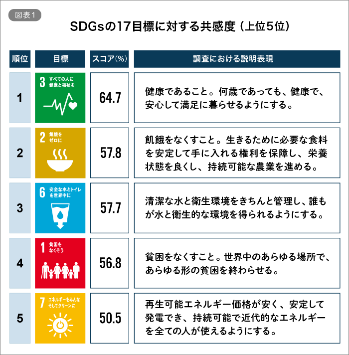 全体でスコアが高かったのは、「3.すべての人に健康と福祉を」(64.7%)、「2.飢餓をゼロに」(57.8%)「6.安全な水とトイレを世界中に」(57.7%)「1.貧困をなくそう」(56.8%)、「7.エネルギーをみんなに、そしてクリーンに」(50.5%)で、半数以上の人が「この考えに共感する」と回答しました。なぜこれらの目標は共感されやすいのでしょうか?