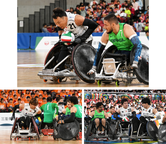 試合は、日本のエース格・池崎大輔、池透暢の両選手に加え、17歳の橋本勝也選手らの活躍で61対42で勝利。観客の多くは、車いすラグビー初観戦のようで、激しいぶつかり合いやスピード感に驚いた様子だった。会場は、試合開始前の選手紹介から、小中高生らの声援、歓声に包まれ大変な盛り上がりを見せた。