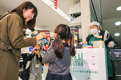 同日、赤羽店の野菜売り場に設けられたブースでは、子どもたちが認定された野菜料理を試食。動画同様に投票を行った。
