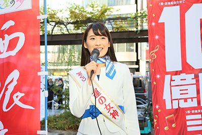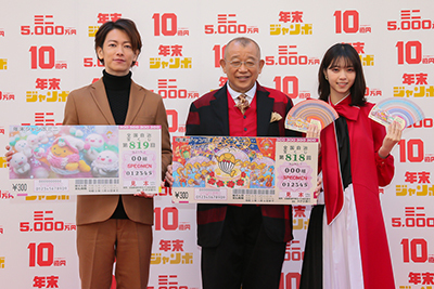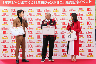 同日、売り場前の特設ステージで行われた発売記念イベントには、ジャンボ宝くじCMキャラクターの笑福亭鶴瓶さんと佐藤健さん、新テレビCM「年末ショーで宝くじ」編で共演するタレントの西野七瀬さんが駆け付けた。