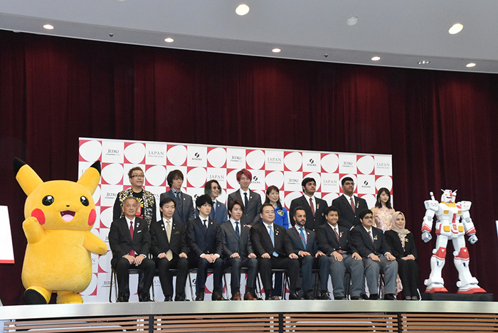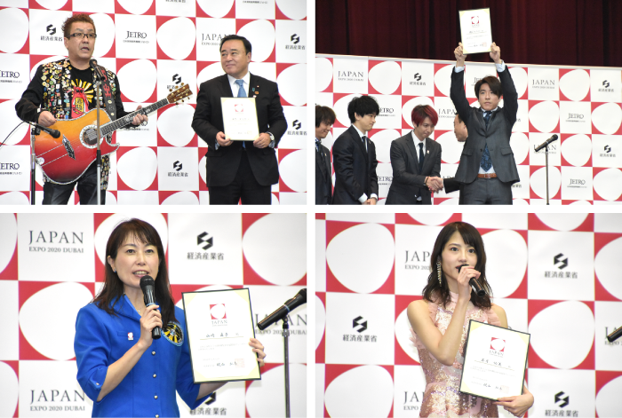 当日政府は、カリド・アルアメリ駐日UAE大使も来場する中で、「ドバイ国際博覧会日本館PRアンバサダー」を任命。シンガー・ソングライターの嘉門タツオさん、アイドルグループの関ジャニ∞、宇宙飛行士の山崎直子さん、女優の若月佑美さん、東海大付属高輪台高校UAE留学生4人の他、人気コンテンツ「ポケットモンスター」「ガンダム」の7組14人を発表し、梶山弘志経済産業相が任命状を手渡した。
