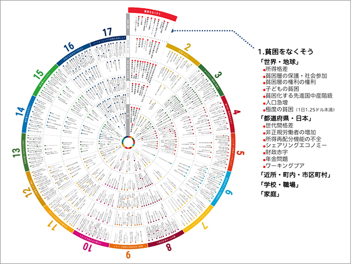 1番目の「貧困をなくそう」というゴールでは、円の中心から例えば、家庭では 貧困家庭 、学校・職場では 賃金格差、都道府県・日本では非正規労働者の増加、 世界・地球では人口急増と、それぞれのスケールでのどのようなことが問題になっていくかがプロットされています。
