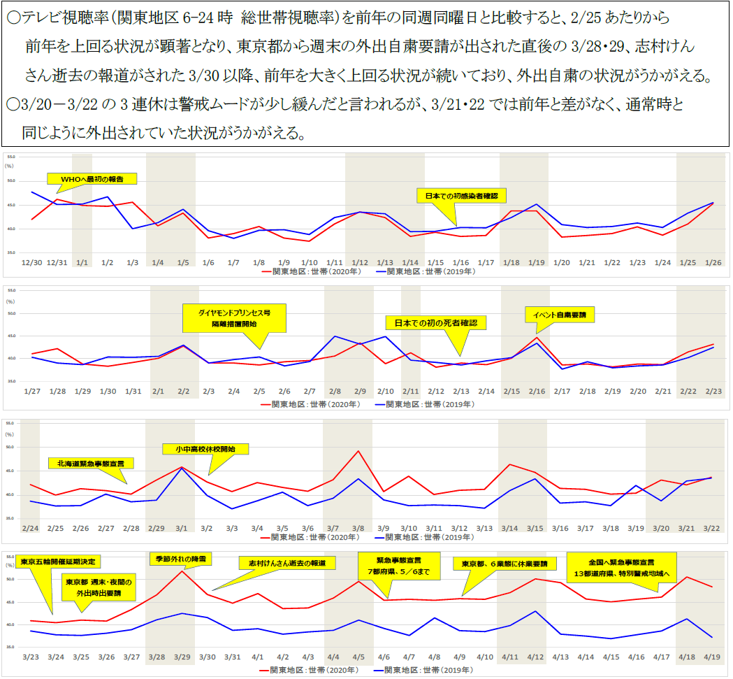 Video Research Ltd. announced on April 23 the changes in consumers' lifestyles and television viewing habits resulting from the spread of the novel coronavirus.