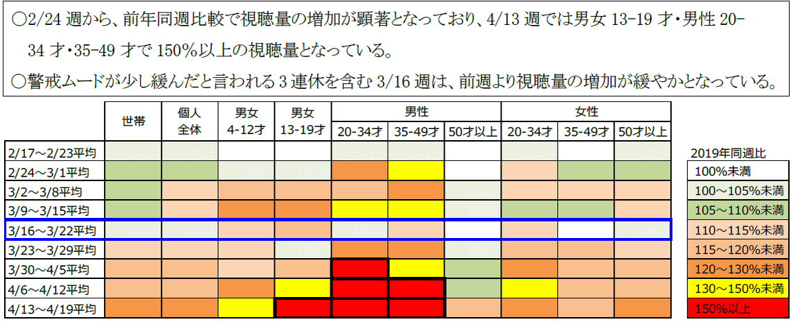Two weeks have passed since the state of emergency was declared for seven prefectures on April 7. The report analyzes how consumer behavior and TV viewing have changed as a result, using data from an online survey and viewership ratings (Kanto region). This section focuses on TV viewership ratings.