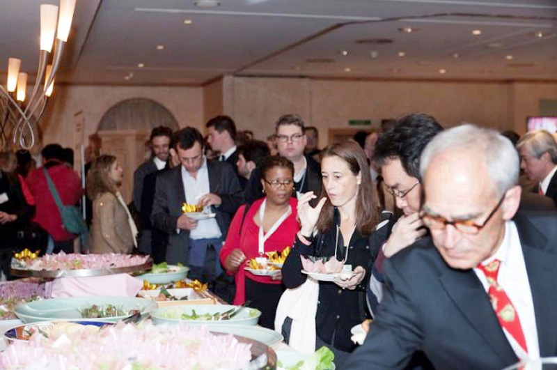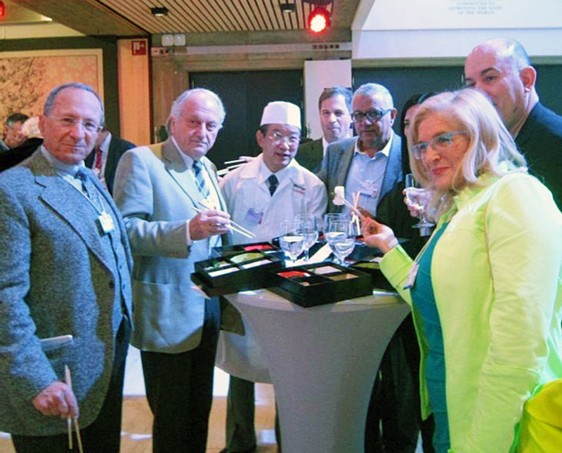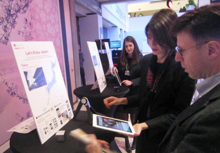 林芳正農林水産相は「和食はユネスコ無形文化遺産に登録されるなど、世界中で知られている」と話し、そのおいしさや健康的なことをアピールした。会場は桜の枝木で飾られ、日本の春の雰囲気が演出された。松花堂弁当や日本酒、日本茶が振る舞われ、参加者から好評を博した。また、最先端の音声認識技術を使い、日本の風景や文化を動画で視聴できる体験コーナーや、手元で3Dプロジェクションマッピングが楽しめる「ハコビジョン」(関連記事:dentsu-ho.com/articles/363)も展示するなど、日本の歴史・文化を紹介。会場全体で「日本」をPRし、多くの要人から「日本を見直した」など称賛の声が上がった。