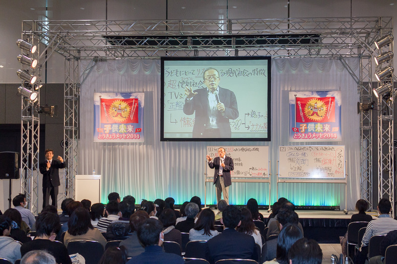 ステージでは、元杉並区立和田中校長の藤原和博氏が「今大切にしたいナナメの関係~地域ぐるみで育てるこどもたち~」と題し基調講演を行った。藤原氏は「親と子、教師と生徒のような縦の関係や友達などの横の関係だけでなく、地域のお兄さんやお姉さん、おじいさんやおばあさんなどとのナナメの関係が大切だ。それがあれば少々のことでは壊れない人間になる」と、3児の父親である自身の経験を交え、地域ぐるみによる子育ての必要性を強調した。