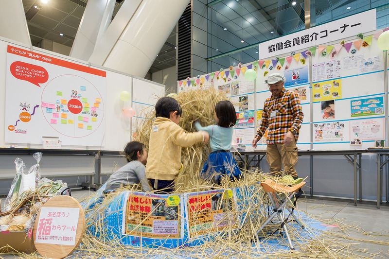 4回目となる今回は、56団体が参加し、約8000人が来場。各団体による出産や子育てに役立つ情報提供や協働事例などの活動紹介、講演やワークショップ、アンパンマンショーなどが行われた。協働会員コーナーの段ボールを使ったアートレッスンや稲わらプールで遊べる自然体験スペースも、親子連れでにぎわった。