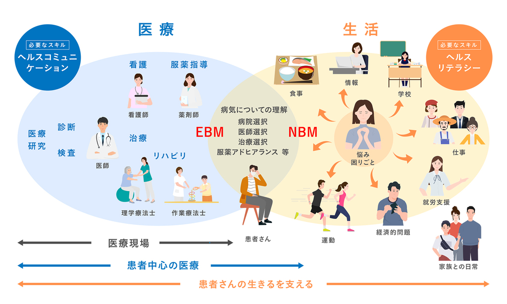 これまでの遅れを取り戻すようにDXが進む一方で、患者さんと医療者とのコミュニケーションや医療の在り方についても変化が見られます。以前は、これまでに行われてきた医学・医療に関する研究成果に基づいたEBM(Evidence-Based Medicine:科学的根拠に基づいた医療)による医療が基本でしたが、最近では、NBM(Narrative-Based Medicine:物語に基づいた医療)も重要と考えられるようになりました。英国の開業医が提唱したNBMは、「患者がなぜ・どのようにして病気になったのか」「病気について今どのように考えているか」などを理解し、患者の抱えている問題に対して、身体的なことだけではなく、精神的・心理的・社会的な視点からもアプローチしていく医療です。