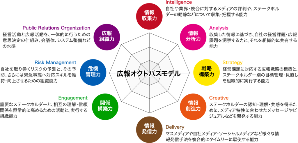 「広報オクトバスモデル」とは、株式会社 電通PRコンサルティングの研究組織である「企業広報戦略研究所」が開発した、企業の広報力を分析する方法です。以下の8つの指標で広報力を評価します。