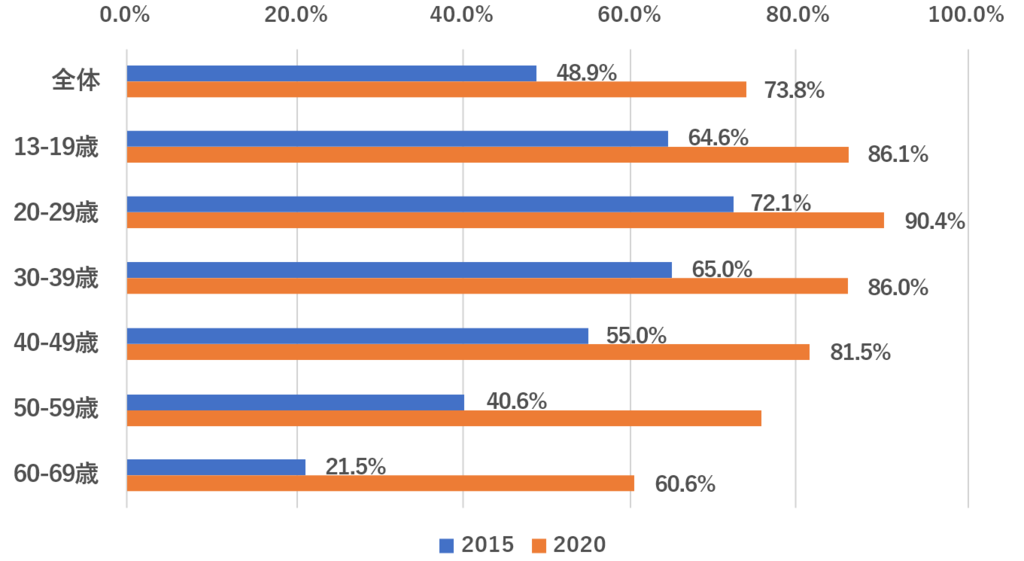 総務省の「通信利用動向調査」によると、2015年から2020年にかけてSNSの利用率が全年齢で20ポイント以上、上昇しています。2020年においては、20代は90%以上、60代でも60%以上の回答者がSNSを利用していると回答しており、SNSを利用していない人の方が少数派となっています。