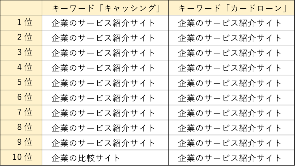 例えば「キャッシング」「カードローン」という2つのキーワードの、2021年11月29日現在の検索順位は以下のようになっています。ブログなど、個人運営のサイトは上位に表示されていないことが分かります。