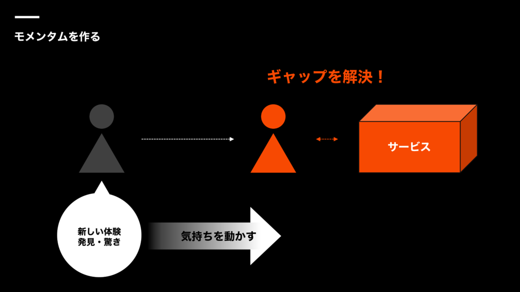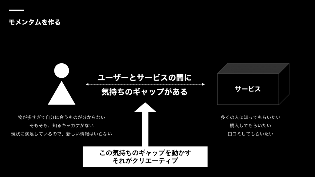 つまり、クリエーティブが作っているのは、CMやキャンペーンというアウトプットそのものではなく、ユーザーとサービスとの間を埋める熱量のデザイン。クリエーティブを通じて「モメンタム」を作っているのです。ここで言うモメンタムとは、「理想と現実の間を埋める姿勢、熱量」のことを指します。