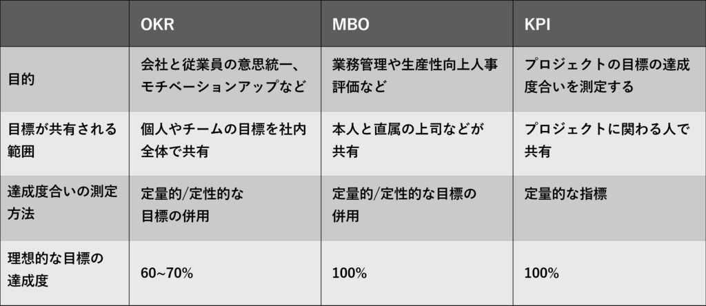 次に、OKRの特徴をよりわかりやすくするために、他の目標管理手法とどのような点が異なるのか見ていきましょう。ビジネスシーンでよく使われる目標管理やマネジメントの指標としては、「MBO」や「KPI」などがあります。
