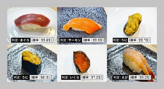 具体的には、「アジ」「イワシ」「コハダ」「マグロ赤身」「中トロ」「大トロ」「ブリ」「サーモン」「炙りサーモン」「生エビ」「ボイルエビ」「イクラ」「ウニ」の13種類の寿司ネタをAIできちんと見分けられるか、というチャレンジです。実際にやってみたところ、イクラやウニは簡単に見分けられますが、やはり「アジ」「イワシ」「コハダ」といった光り物系は見た目も似ていて判定が難しい。それでも、これら光り物3種類においても、8割以上の正解率となりました。