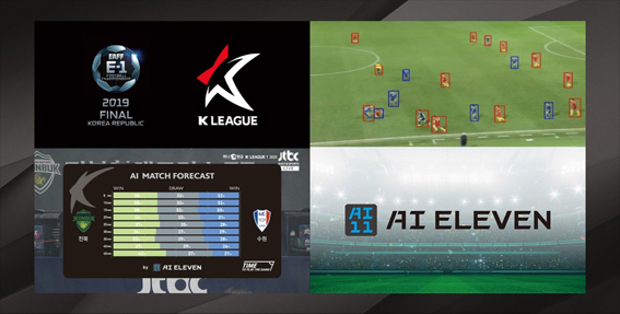 AI ELEVENは、サッカーの試合結果をリアルタイムに予測するユニークなAIです。試合のライブ映像から選手やボールの動きを検出し、複数のAIを用いて分析。視聴者は瞬時に戦況を把握することができます。既に、東アジアサッカー連盟(EAFF)が主催する国際大会「E-1サッカー選手権」や、韓国のKリーグなどで実証実験を行った実績があります。