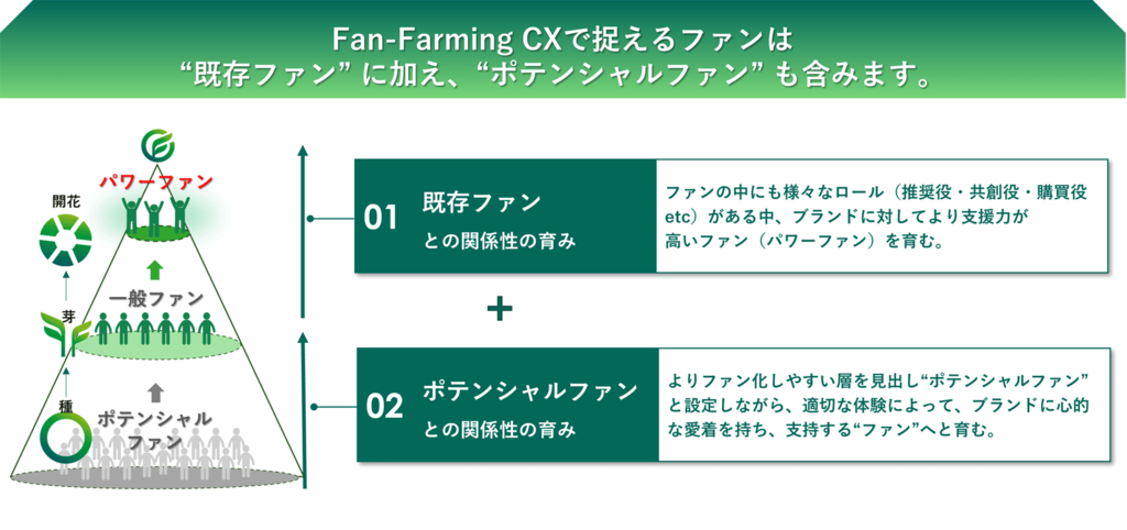 従来のファンマーケティングは、どちらかと言えば既存のファンをとことん重視するという考え方でした。しかし、既存のファンだけでは、将来的な裾野の広がりは、なかなか望みにくいかもしれません。「Fan Farming CX」というソリューションでは、熱量の高いファンについて調査することで、どのようにしてファンが生まれるのか、その傾向を分析し、既存ファンのみならず、ポテンシャルファンを育てることにつなげていきます。そして、ポテンシャルファンを企業やブランドを支える“パートナー”になり得る熱量の高いパワーファンへと育んでいくことで、企業やブランドもともに成長していくことができるのです。