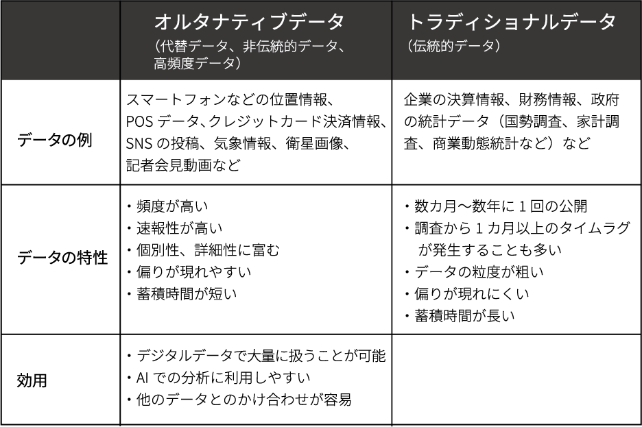 ここからは、トラディショナルデータとの違いを確認しながら、オルタナティブデータについてより詳しく見ていきましょう。