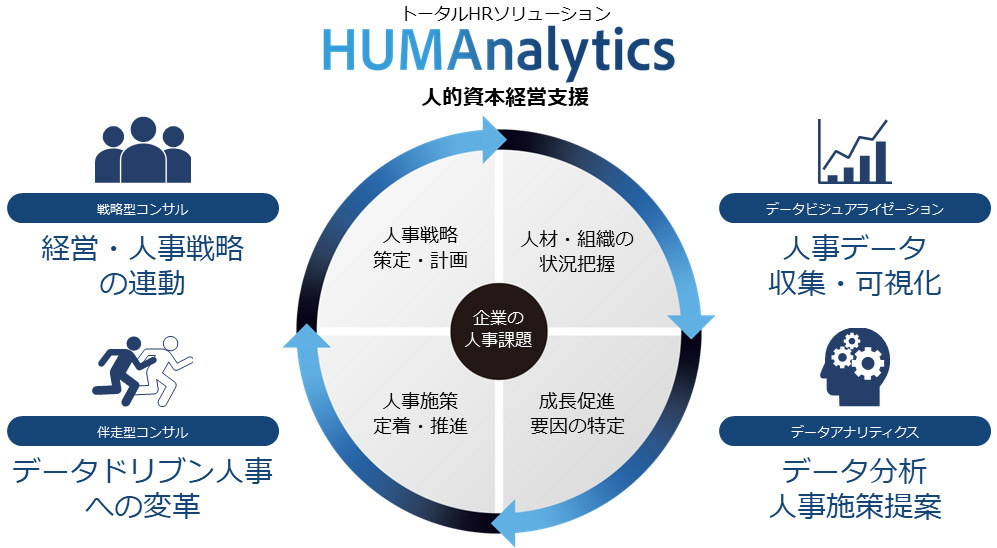 上場企業に対する人的資本開示の義務化、経営戦略と人事戦略の連動、データドリブン人事への移行など、人事を取り巻く環境は今、大きく変わりつつあります。「人事の課題をあらためて見直したい」「採用・育成・配置・評価など幅広い領域でデータを活用したい」など、企業によって直面している問題も大きく異なるのではないでしょうか。「HUMAnalytics」のようなサイクルを通じて企業価値向上につなげることができるトータルHRソリューションを導入することが、課題解決の一助となるかもしれません。