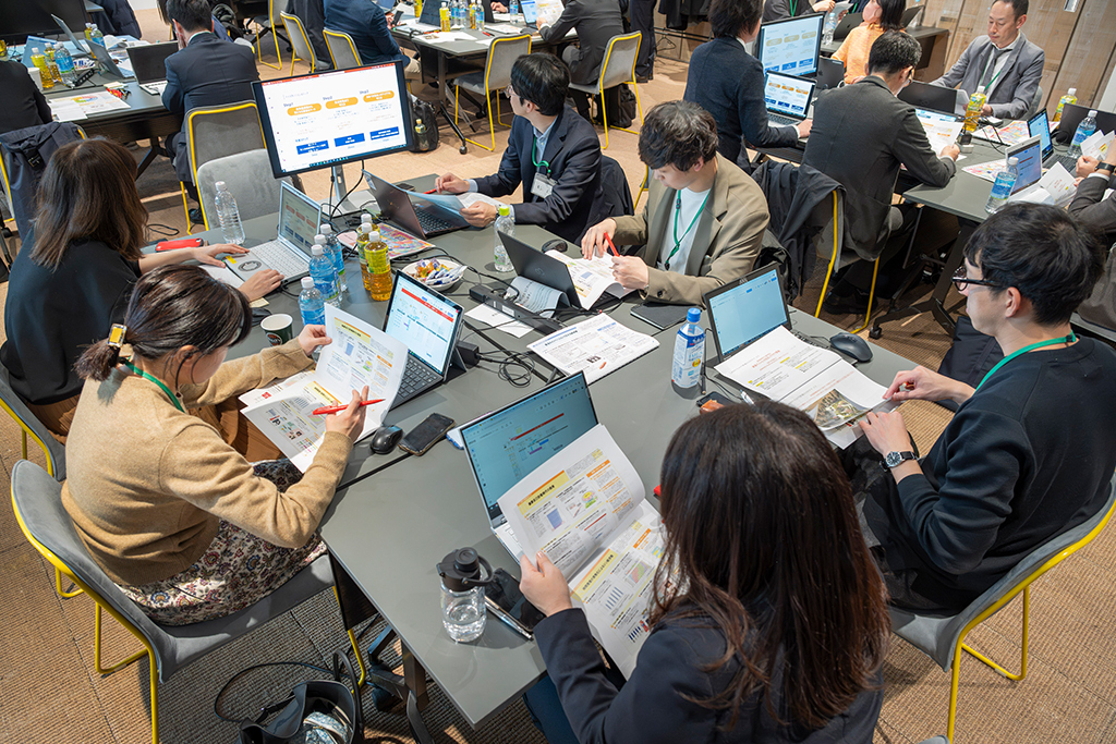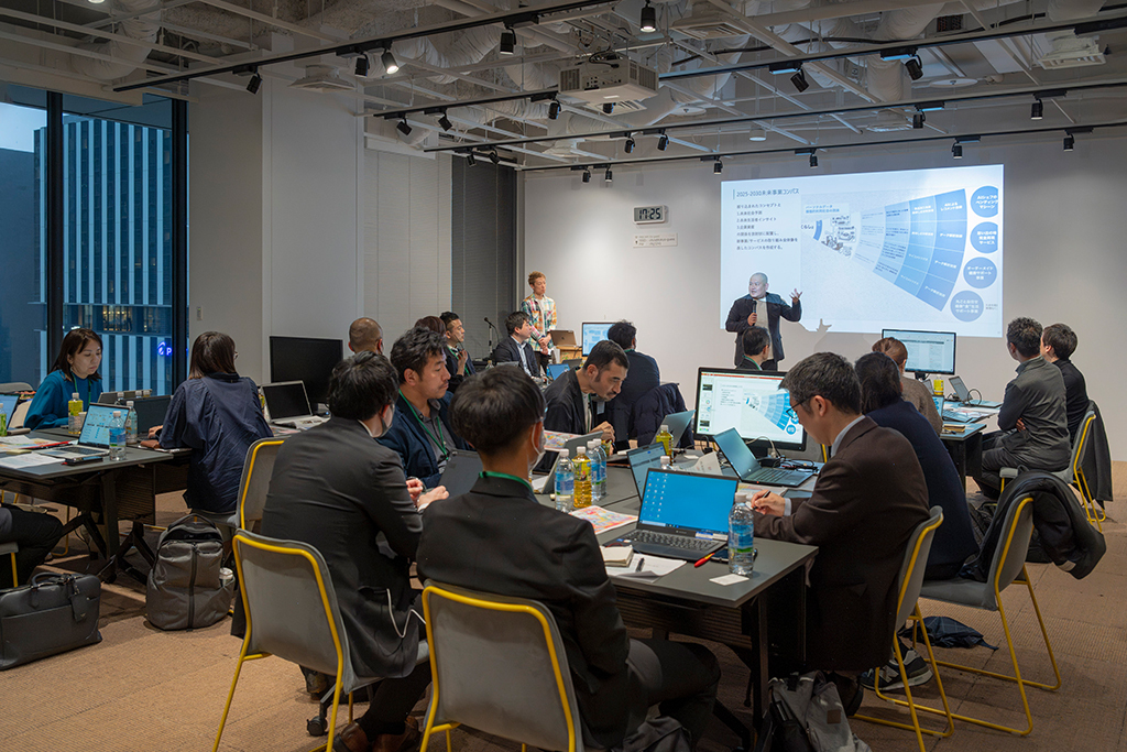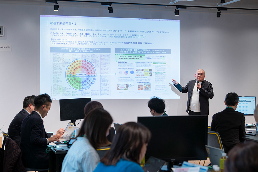 「未来曼荼羅2024」の提供開始に伴い、3月25日には国内電通グループ6社共催によるワークショップが開催されました。参加したのは、「既存商品・ビジネスを超える新しいアイデアを創り出したい」、「効果的な事業開発の進め方を模索したい」といった新規事業・サービス開発に課題を抱える企業の方や、電通グループとの連携・提携を検討する企業の方など、さまざまな業界から応募し抽選で選ばれた約30名。同ツールを活用し、新規事業開発プログラムの一部を実際に体験しました。