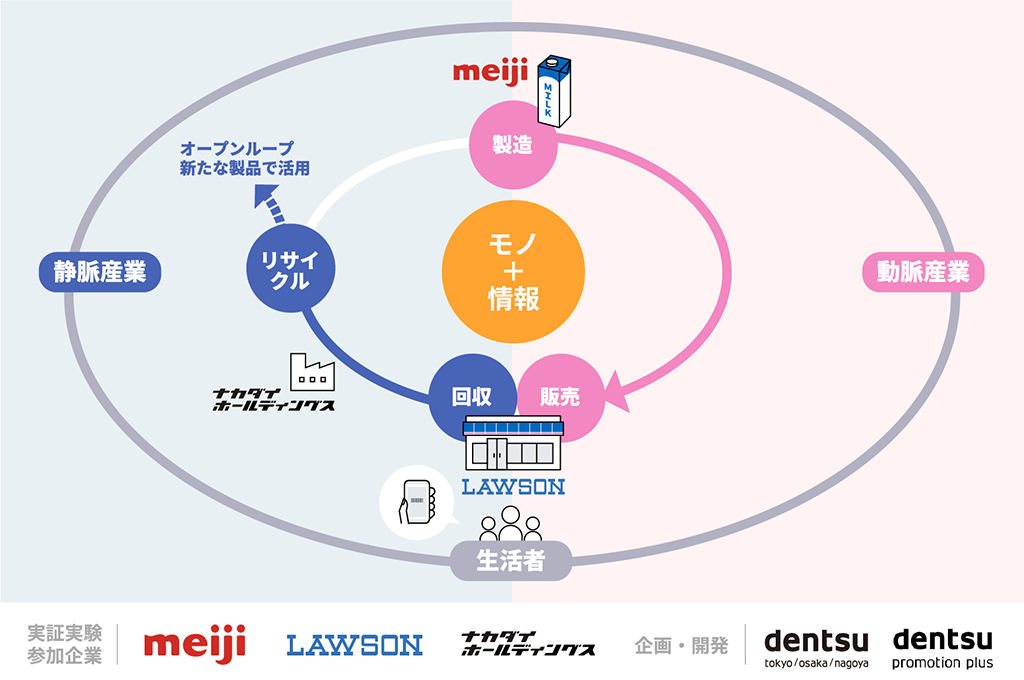 空容器などの「回収・リサイクル」に、クーポン・ポイントなどの「販促」を組み合わせた新しい循環経済の枠組み「で、おわらせないPLATFORM」。このプラットフォームを設計した株式会社 電通と株式会社電通プロモーションプラスは、2024年1月末までの2カ月間、株式会社 明治、株式会社ローソン、株式会社ナカダイホールディングスの3社と共に実証実験を実施しました。