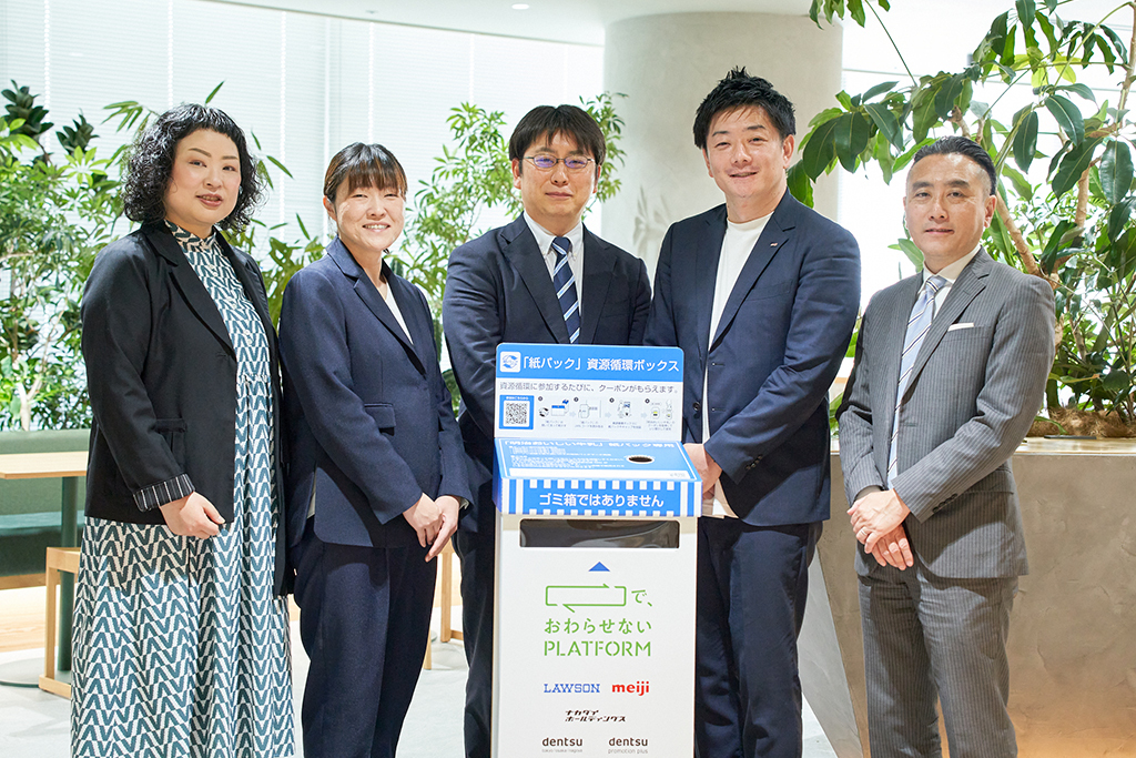 本記事では、実証実験のその後に着目。前編は、明治の小池康文氏、ローソンの瀧澤修氏、ナカダイホールディングスの河西桃子氏、そしてプラットフォームの設計に携わった電通プロモーションプラスの諏訪薫治氏、電通サステナビリティコンサルティング室の堀田峰布子氏が、社内外の反響や今後の展望を語りました。