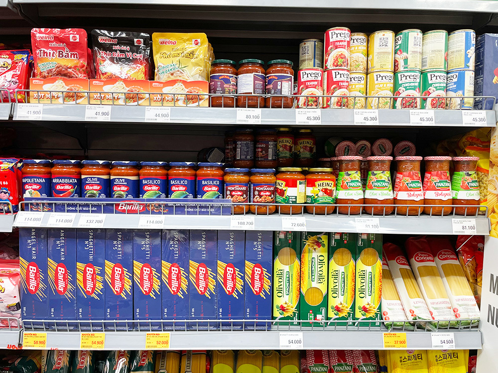 日清製粉ウェルナの商品もベトナムの棚に2024年より並ぶ。写真左上。