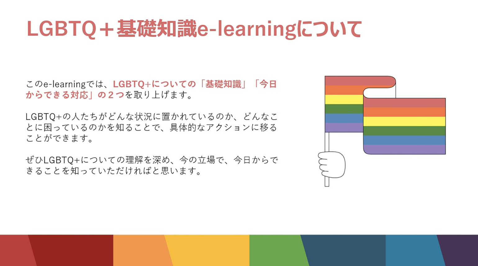 全社員向けのLGBTQ+に関するe-learningのベース資料として、「アライアクションガイド」を活用しました。ガイドの内容を自社向けに再編集し、スライドとクイズで構成しています。