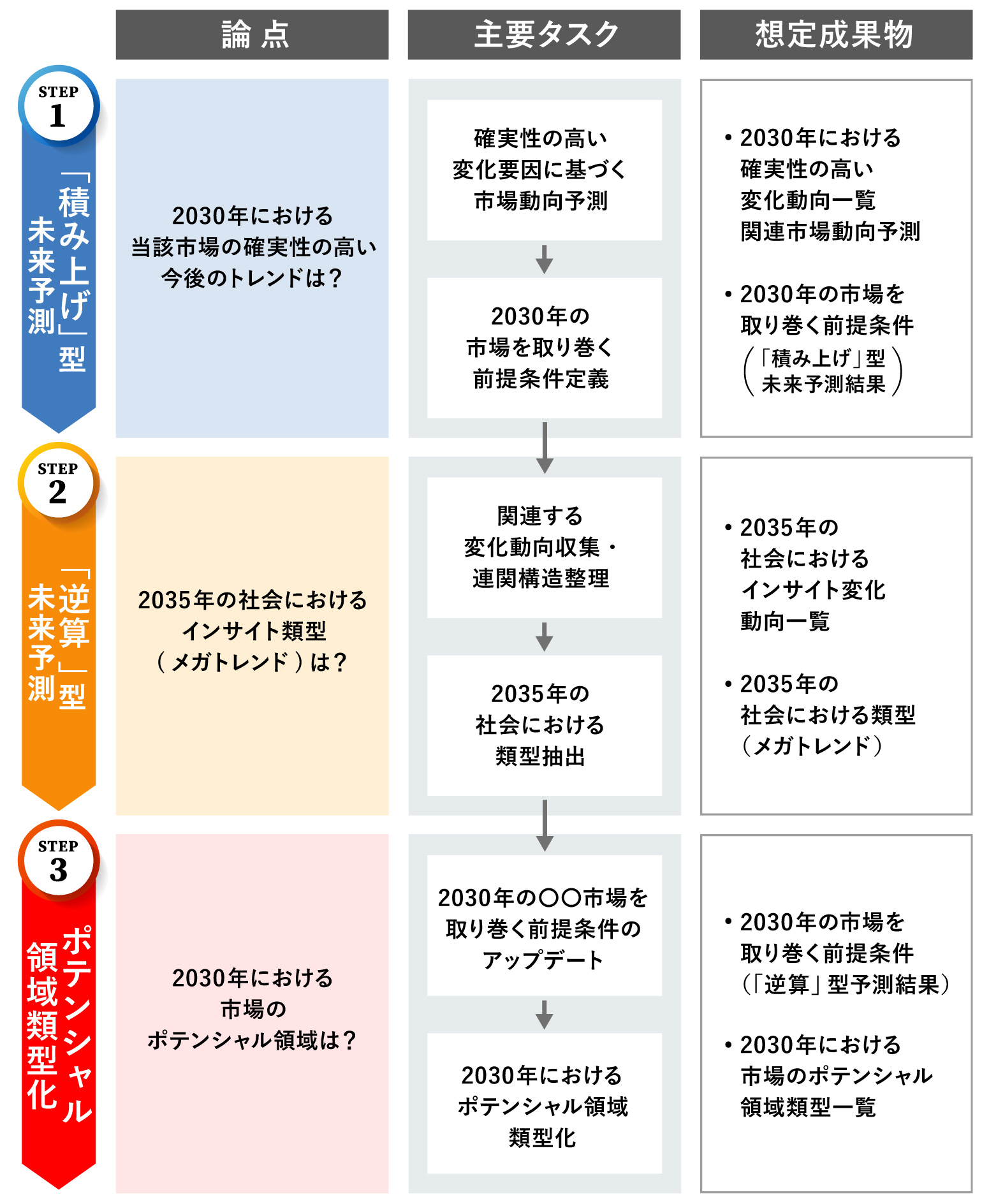また、上の図には記載していませんが、ステップ3で類型化したポテンシャル領域ごとに自社の強みを生かした戦略テーマまで導出するケースも多いです。