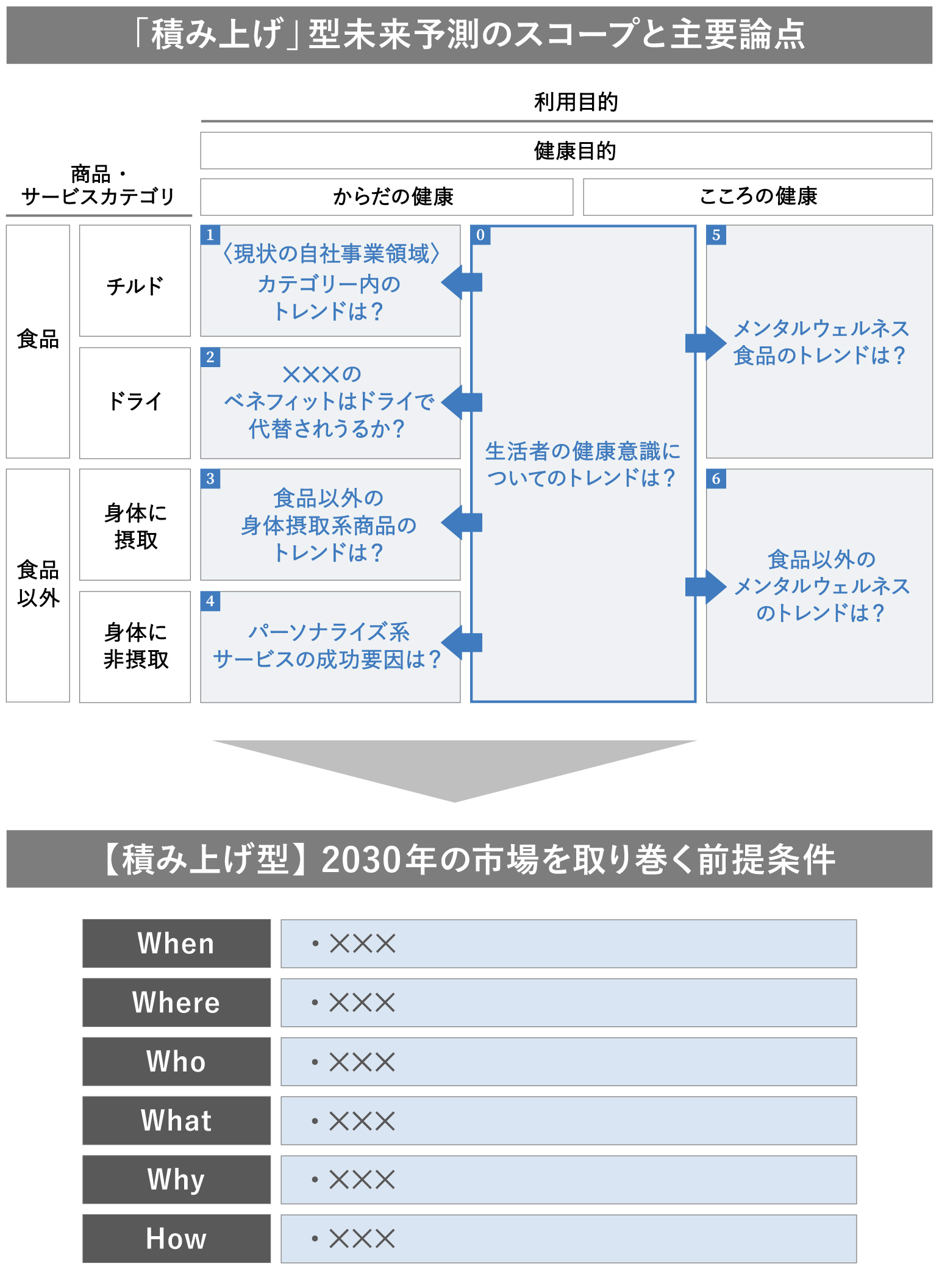 生活者の健康意識についてのトレンドを起点に、その影響を踏まえた6つのセグメントの市場動向リサーチに基づき、「積み上げ」型で2030年の市場を取り巻く前提条件を5W1Hで定義します。