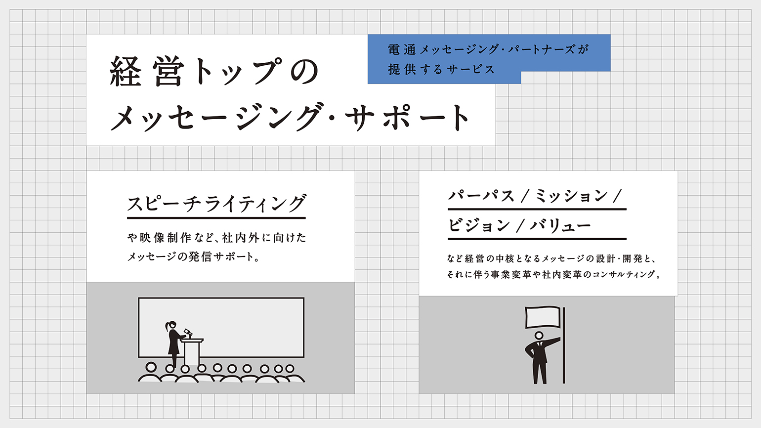 そんなスタンスのもと、私たちは「メッセージング・サポート」というサービスを提供しています。経営トップや組織のリーダーをはじめ、経営企画、広報部門の方々からのご相談も増えています。みなさんからは、「メッセージング」の課題は感じていたものの、どこに頼めばいいのかわからず困っていた、という声も少なからずいただいています。