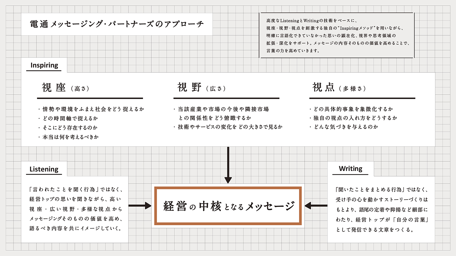 このような対話を経た上で、原稿やメッセージの案を書き上げ、ふたたび対話を重ねる。それが「経営の中核となるメッセージ」を形にしていく、私たちのアプローチです。