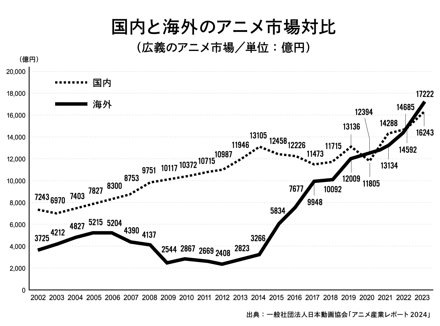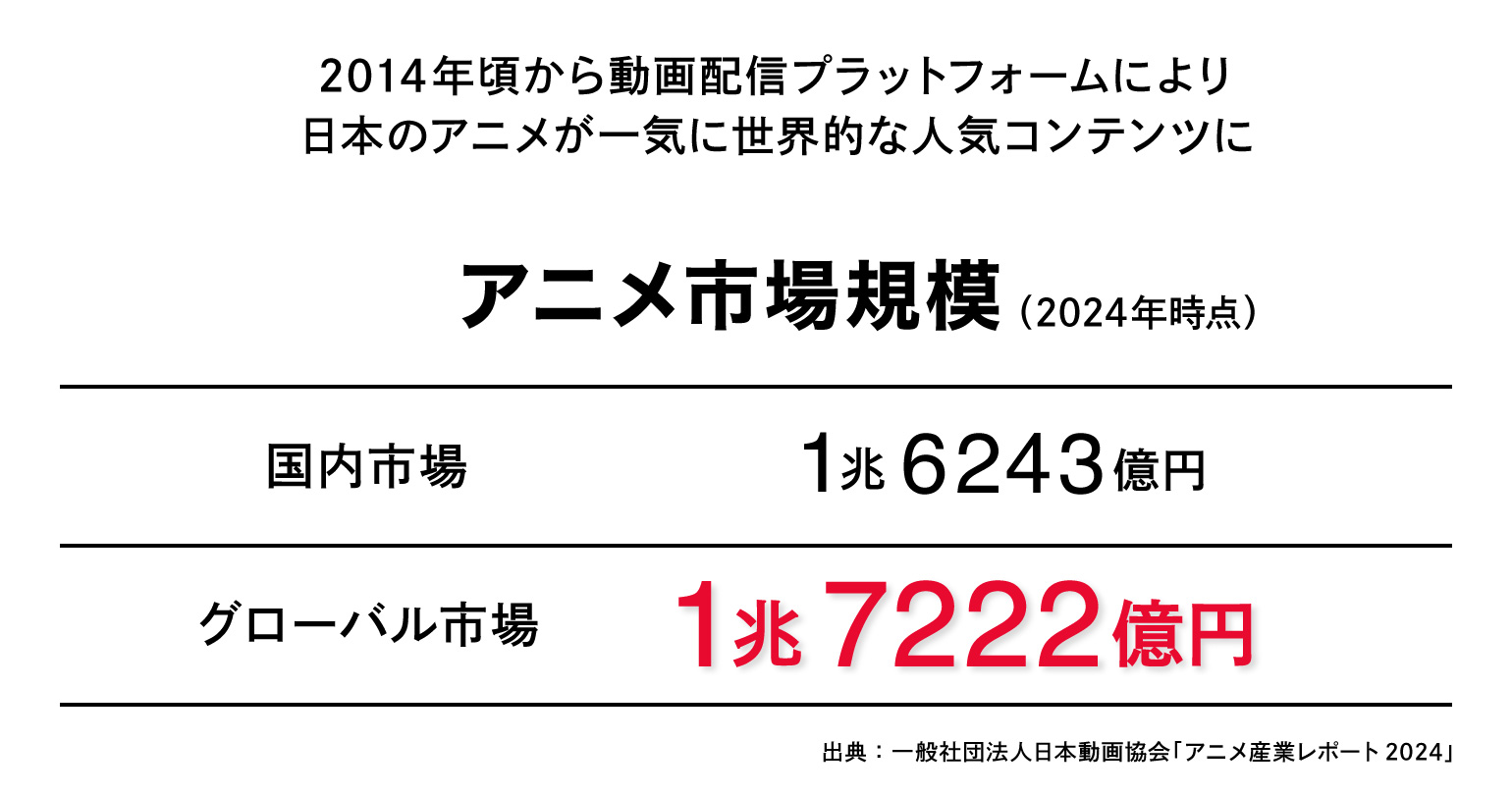3兆円産業となった日本アニメ。動画のサブスクリプションサービスが普及しはじめた2014年頃を境に海外市場が急伸。今や日本市場を逆転し、海外売上の方が大きくなっている。 ──今回、日本アニメとしては異例とも言える、新作アニメの大々的な海外プロモーションが行われました。数ある作品の中で「ガチアクタ」を選んだ理由をお聞かせください。
