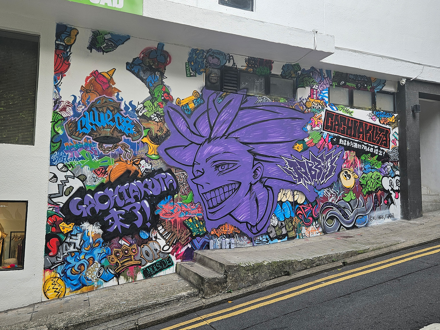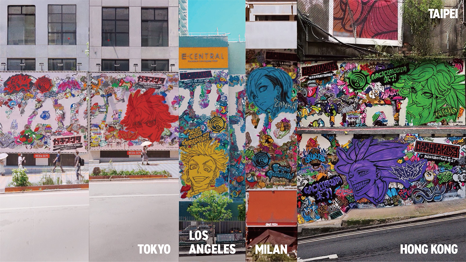 廣畑:「Gachiakuta World Takeover」というコンセプトを体現する目玉施策が1つ欲しいと考えていたときに考えついたのが、巨大なグラフィティがつながる屋外広告です。世界5都市で同時に連動するプランを発案し、1つにつなげると「Watch Out World!(=見てろよ、世界!)」と世界中のファンに向けた、アニメ放送開始直前のメッセージが浮かび上がる仕掛けを施しました。 この屋外広告は、キャラクタービジュアルと晏童先生の手掛けたグラフィティを中心にわれわれでもデザインを行い、それを各国のペインターたちが手描きで仕上げるという、細やかな努力によって実現しています。現地の方々の多大な協力のもと、電通のグローバル・ビジネス・センター(GBC)などの力を総動員して実現することができました。