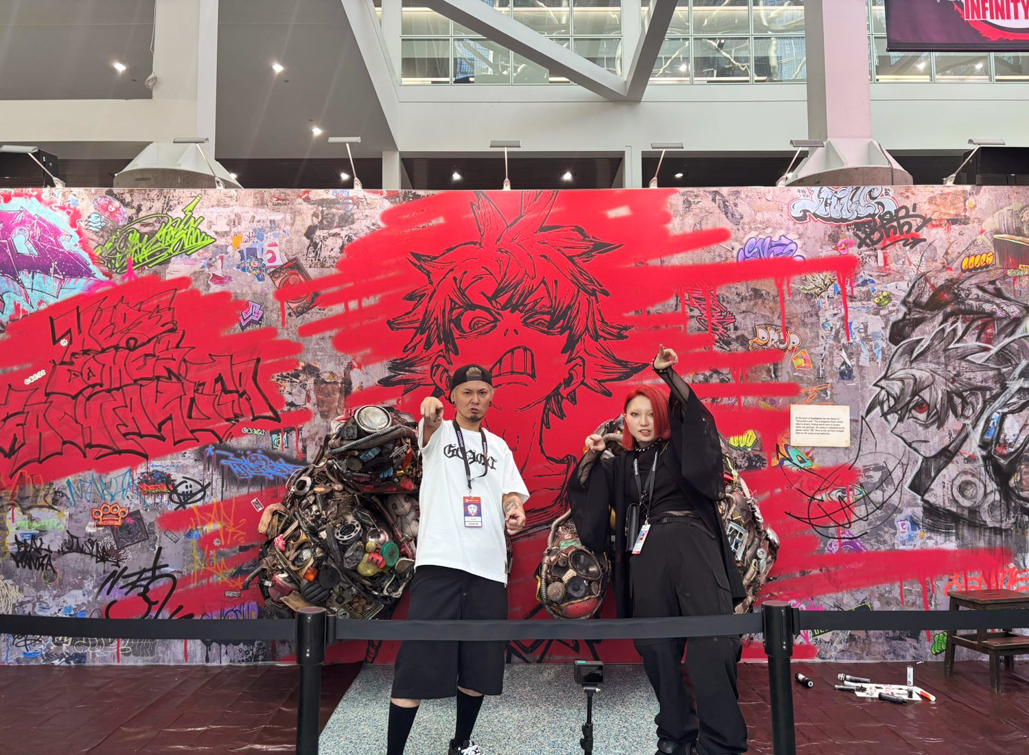 廃材による巨大造形アート横で裏那先生と晏童先生が壁面にライブペインティングを実施。人だかりができるほど注目されるブースに。 可能性は無限大!日本IPを世界へ発信するための「発明」は続く──あらためて、海外ファンが喜ぶコミュニケーション設計というのは、どういうところにポイントがあるのでしょうか?