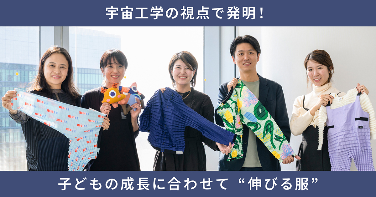 飯沼: “成長する服”というコンセプトはユニークです。最初は小さな服が、引っ張ると大きなサイズになり、また押し込むと小さなサイズに戻るPetit Pliの技術には、宇宙工学の知見が生かされているとのことですが、どのようにして現在の形に至ったのでしょうか?