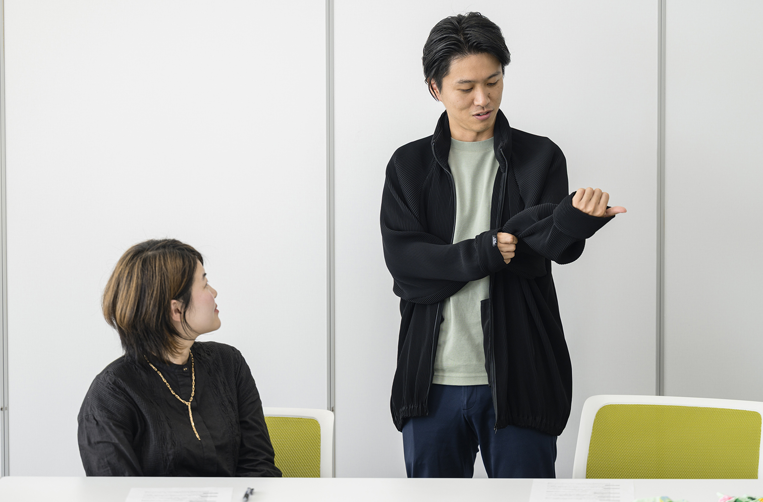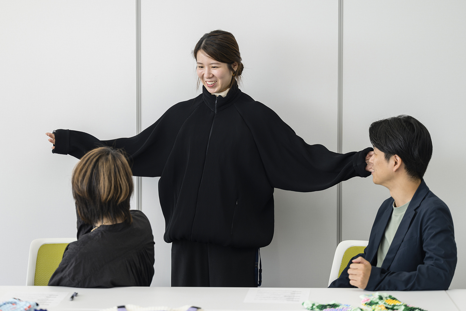 Petit Pliの大人向けのジャケットを山本と藤井が試着。子ども服と同じく伸び縮みし、サイズもデザインもジェンダーレスで、誰にでもよくなじむ。 特許を取った「伸び縮みする素材」で、多分野での展開も見据えたい飯沼:今後のプロダクト展開について、何かイメージされているものはありますか?
