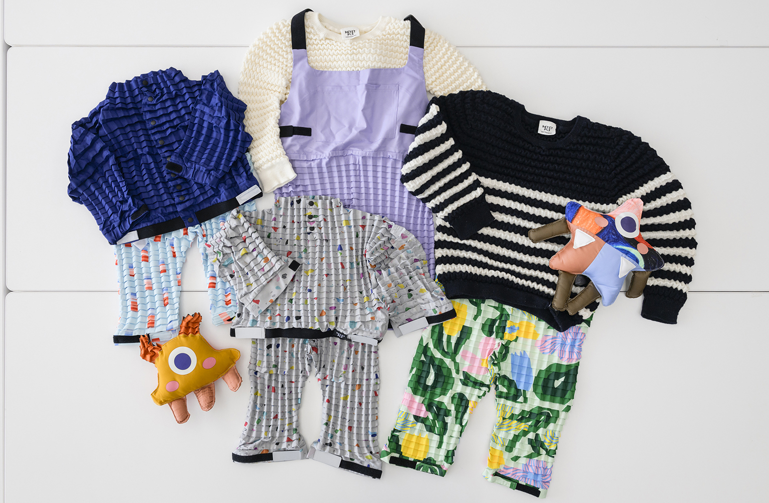 Petit Pliの服と、端材から作られたぬいぐるみ。