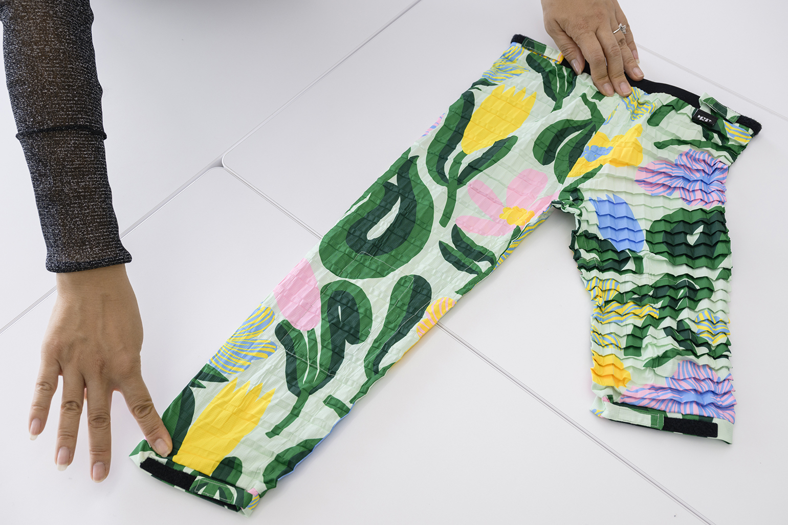 飯沼:伸ばしてみると「あ、このプリント柄はチューリップだったんだ!」 みたいな発見がありますよね(笑)。面白い!プリント柄や色、デザインも特徴的ですね。