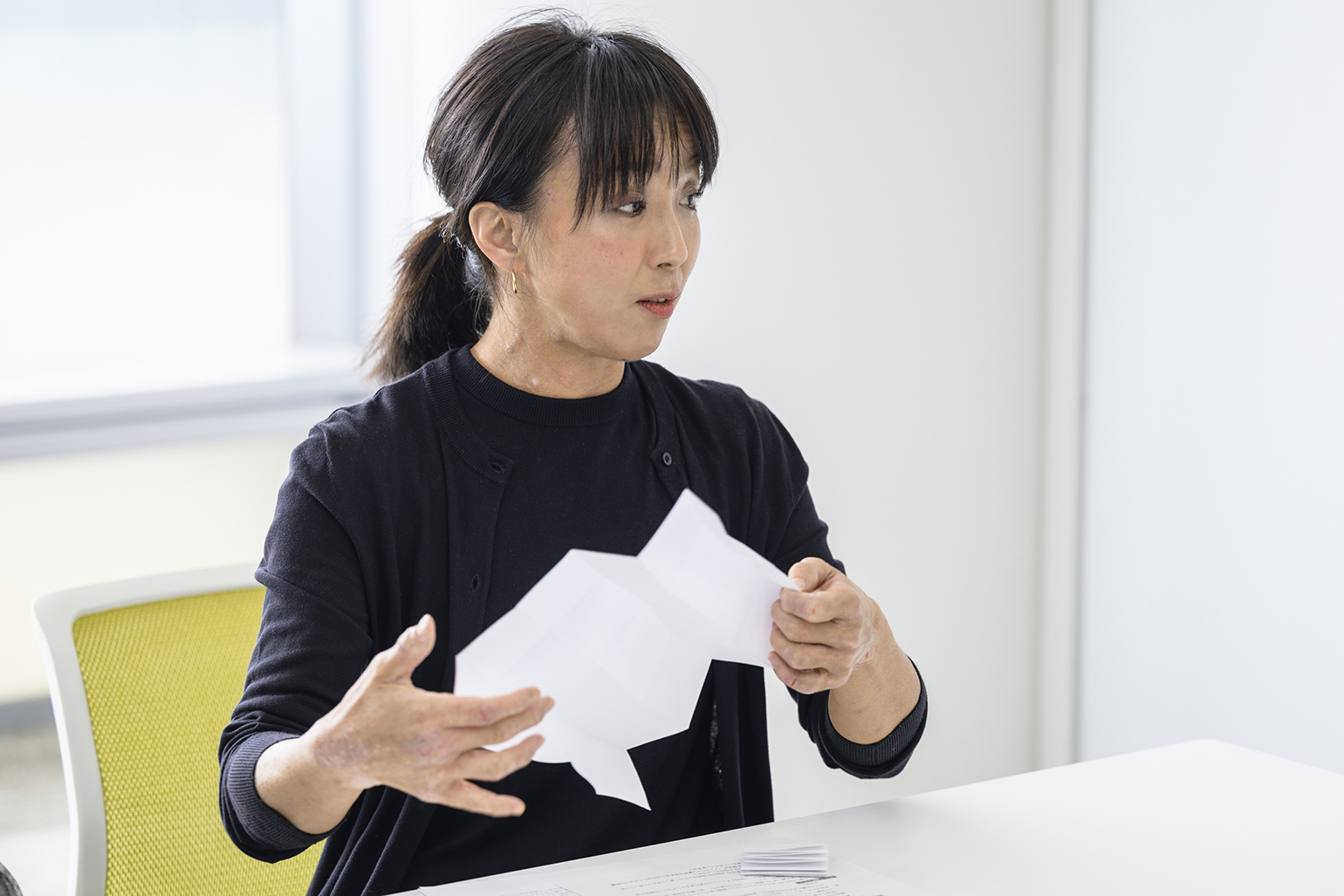 SKY吉田氏が手にしているのはミウラ折りで折り畳まれた紙。人工衛星の太陽光パネルでも用いられている技術で、Petit Pliの大きなインスピレーション源となっている。 飯沼:これから日本で本格展開するに当たって、どのような広がりを期待されていますか?